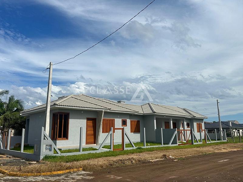 Casas geminadas à venda no balneário Figueirinha em Arroio do Sal, a 400 metros do mar. Cada unidade possui três dormitórios, sendo uma suíte, um banheiro social, churrasqueira e garagem para um carro. Posição solar frente oeste.