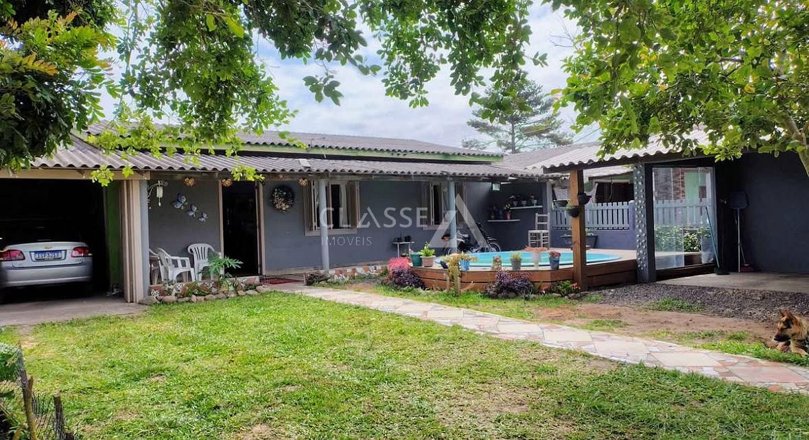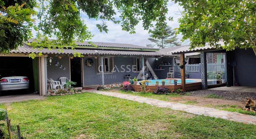 Casa à venda no balneário Praia Azul em Arroio do Sal. Possui três dormitórios, dois banheiros, sala/cozinha, área de lavanderia, garagem, piscina e quiosque. Imóvel de esquina.