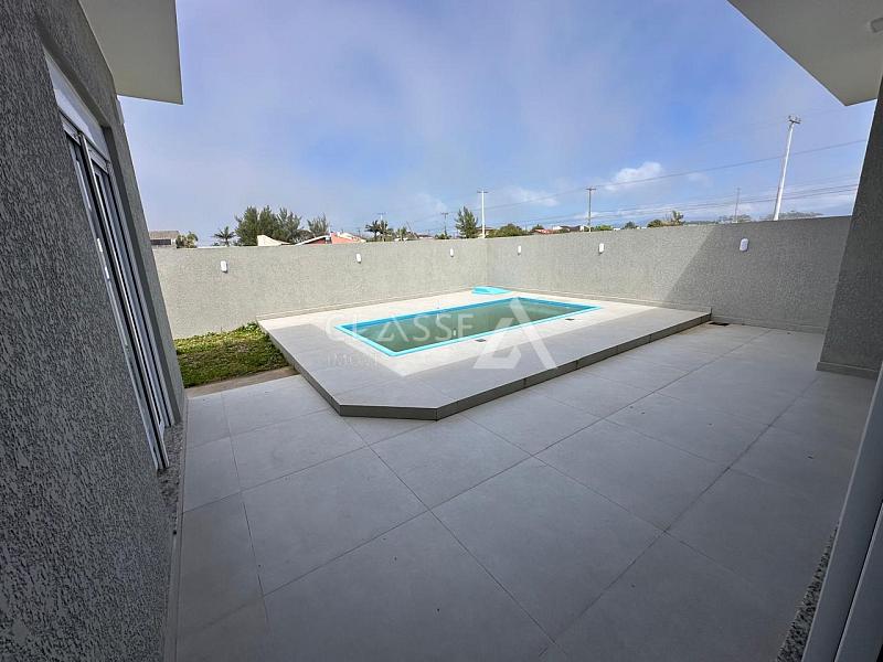 Casa à venda no balneário Sambaqui em Arroio do Sal. Localizada a apenas 100 metros do mar, esta bela residência possui três dormitórios, sendo uma suíte, garagem para dois veículos, lareira, churrasqueira e piscina. Com 118m² de área construída e terreno medindo 12x25. Posição solar frente norte.