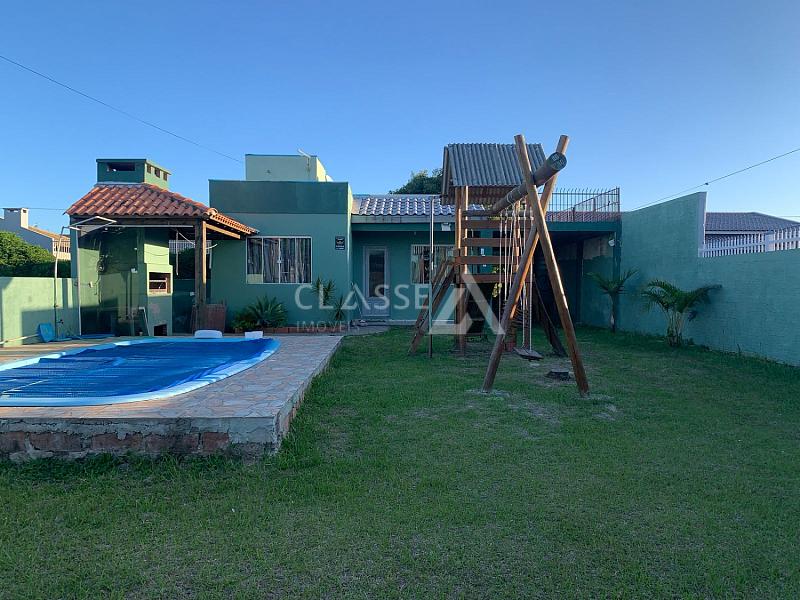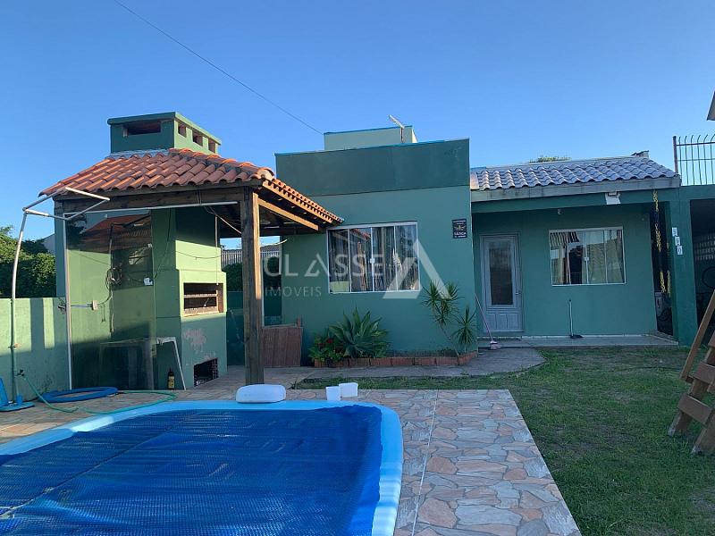 Casa à venda na Praia Paraíso, Torres! Conta com três dormitórios (sendo uma suíte), banheiro social, sala e cozinha integradas. Com 87,26m² de área construída mais quiosque, piscina e sala de jogos. Possui área cercada e dois quartos com ar-condicionado. Aceita carro, moto,  terreno como parte do pagamento e parcelamento direto.