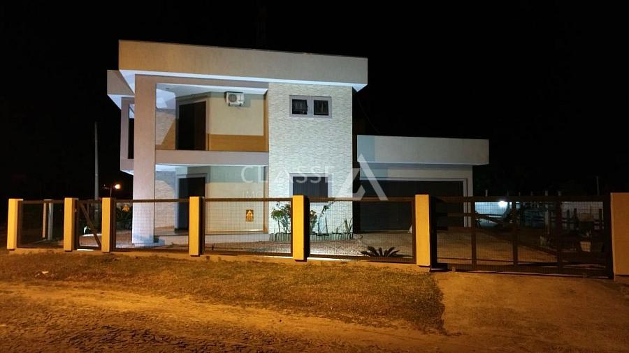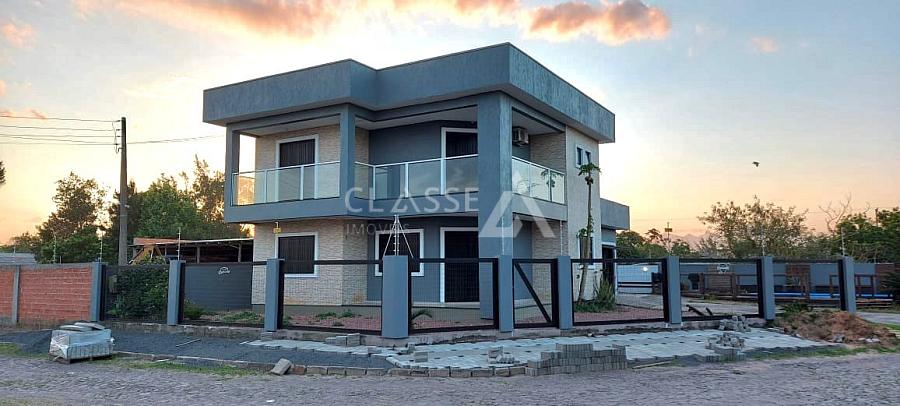 Casa exclusiva à venda no bairro Quatro Lagos em Arroio do Sal. Construída em 2010, tem 212 m² construídos em um terreno de esquina com divisa para área verde e frente para uma rotatória, garantindo total privacidade. Possui quatro dormitórios, sendo duas suítes (uma com banheira de hidromassagem) e três banheiros sociais, ampla garagem de 60 m², churrasqueira rotativa, mesa de sinuca, cozinha e sala conjugadas e um terraço sobre a garagem. Dois pavimentos com laje pré-moldada, revestimentos de porcelanato retificado, iluminação LED em toda a casa, aquecimento solar e a gás, água quente em todos os pontos, móveis planejados na cozinha interna e na garagem. Mobiliada (excluindo apenas itens pessoais e eletrônicos). A área externa inclui piscina com aquecimento solar, portão eletrônico, cerca elétrica e sistema de alarme.